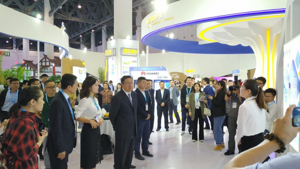 眉山市市委書記慕新海視察展位,與參展企業代表溝通。新漁生物,西博城6號館,眉山市展區與您相約!