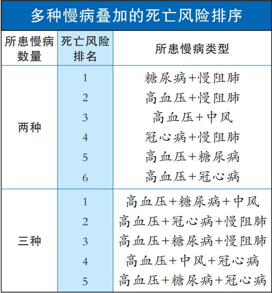 “共病”更是加劇了慢病威脅。6月5日,鄭州大學公共衛生學院發表的一項對5萬名65歲及以上中國人的研究發現,多發慢病與全因死亡率呈正相關。與沒有慢病的參試者相比,具有1、2和3種慢病者全因死亡率分別增加45%、72%和115%(死亡風險排序見圖表)。此外,吸煙飲酒、體重過輕、運動不足的人死亡風險較高。