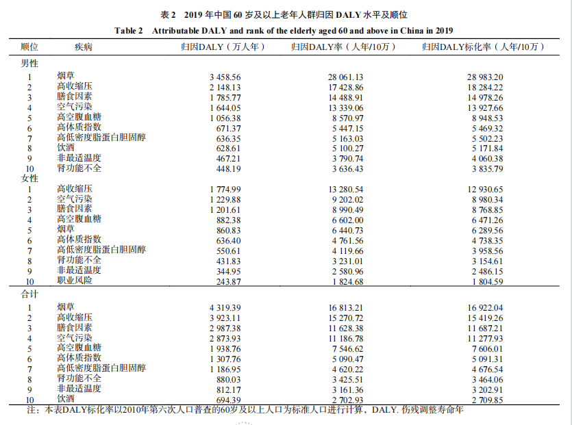 另外,與2009年相比,2019年影響中國60歲及以上老年人群健康的危險因素順序也發生了變化。其中,膳食因素、高體質指數、腎功能不全和飲酒的順位有所提高,而空氣污染、高低密度脂蛋白膽固醇和非最適溫度的順位出現下降。
