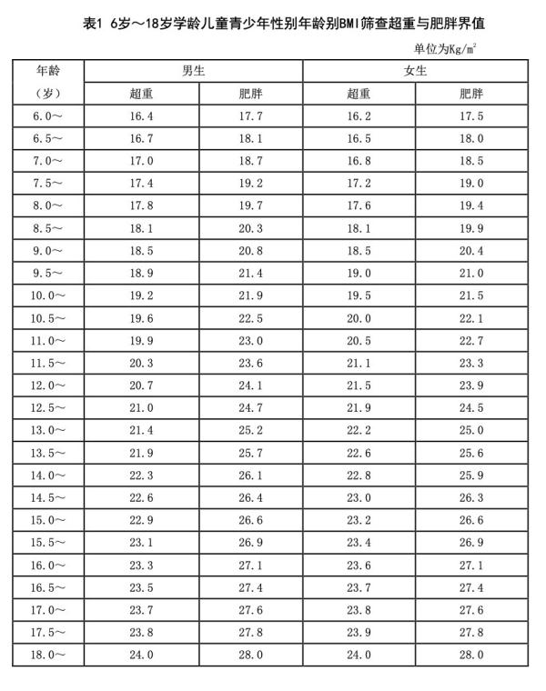 體質指數(BMI)是國際社會推薦的評價兒童(≥2歲)超重和肥胖的首選指標,BMI=體重(kg)÷身高的平方(m2)。孩子每個年齡階段的BMI是不一樣的:1歲時BMI值最高,隨后開始下降,到6歲~7歲脂肪重聚期開始出現反彈,此后逐漸升高至接近成年人的水平。2-5歲兒童參考“中國0-18歲兒童、青少年體塊指數的生長曲線”中2-5歲兒童超重和肥胖BMI篩查界值,6歲及以上兒童參考中國行業標準“學齡兒童青少年超重與肥胖篩查”(WS/T 586-2018)界值點。