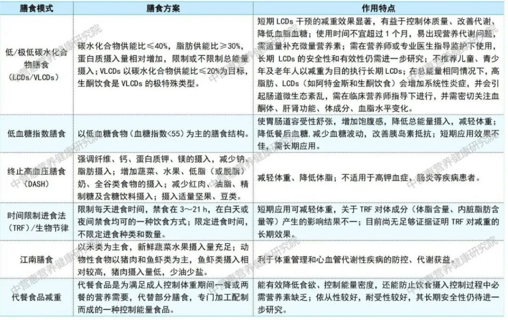 能量平衡是影響體重的關鍵因素,攝入的能量少于消耗的能量才能實現體重控制的目標,飲食干預在其中起著關鍵作用。飲食干預通過合理調整飲食結構和控制能量攝入,幫助人們實現健康的體重管理;且飲食干預相對容易實施,不需要高昂的費用和復雜的設備,人們可以在日常生活中輕松進行。因此,無論是從健康角度還是經濟角度考慮,飲食干預都是一種理想的體重管理方式。以下我們將重點介紹幾種常見的減重膳食模式,并列出其他一些常見的減重膳食模式及特點供大家參考(表1)。