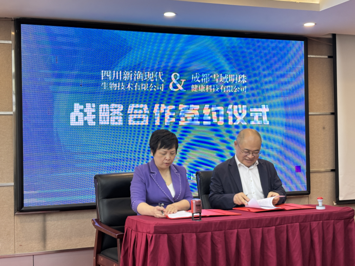 2025年4月29日,四川新漁現代生物技術有限公司與成都雪域明珠健康科技有限公司在眉山正式簽署戰略合作協議。雙方秉持“資源共享、共謀發展、共創共建”原則,聚焦高原人群健康領域,在慢病研究、品牌推廣等多維度展開深度合作,攜手推動分子營養與藏區醫療資源的創新融合。